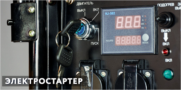 - Электростартер: устройство активирует генератор поворотом ключа. Система работает на встроенных 12–вольтовых аккумуляторных батареях. Запуск надёжен даже в морозы, не создавая проблем владельцам.